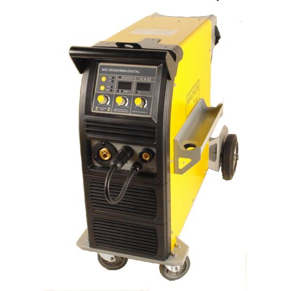 MIG 350GN/MMA DIGITAL jest zaawansowanym technologicznie półautomatem spawalniczym z możliwością spawania elektrodami otulonymi (MMA). Urządzenie przeznaczone jest do spawania stali niskowęglowych, stali niskostopowych, stali stopowych, brązów, miedzi itd. MIG 350GN/MMA DIGITAL umożliwia spawanie drutami spawalniczymi(w tym drutami rdzeniowymi) o średnicy 0,8-1,2 mm oraz elektrodami otulonymi o średnicy 1,6-6,0mm. MIG 350GN/MMA DIGITAL przystosowany jest do zasilania z sieci trójfazowej 3x400 V/50 Hz i wyposażony w przeciążeniowy układ zabezpieczenia termicznego, zapobiegający nadmiernemu nagrzewaniu się.